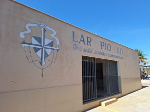 A segunda visita do dia foi ao Lar Pio XII, situado na Rua VMR, Qd 31, Lt 16, na Vila Mutirão em Goiânia. Trata-se de uma obra social da Congregação das Irmãs Dominicanas do Santo Rosário, que tem como missão servir e promover a vida, educando, instruindo e cuidando de pessoas em situação de vulnerabilidade social.